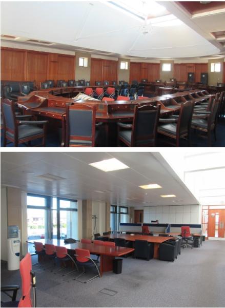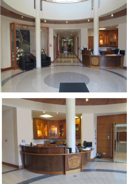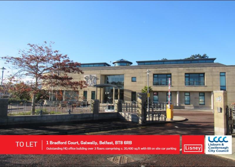 To Let: HQ Office Building The building comprises a 2-storey over basement purpose built HQ office building. The building has a steel portal frame construction with a mix of sandstone block and glazed elevations and a feature semi-circular glazed entrance foyer with full height atrium and stained glass ceiling. Internally the building comprises basement, ground and first floor accommodation; with the ground & first floors similar in layout and specification. The basement currently provides a gymnasium / fitness suite, shared IT server room, file storage, strong room, kitchen and shower facilities. There is also a Plant room for the entire building. The first & second floors comprise a shared entrance lobby, reception and toilet facilities with a mix of open plan and cellular offices. Externally the property provides private parking provisions for 69 no cars. The car park is individually laid out and finished with brick paving. There is also attractive mature landscaping and a pond. The site is fully self-contained with security controlled access gates, security office at main entrance and perimeter lighting. Please Note: This does not include part of the ground floor which will continue to be occupied by Lisburn & Castlereagh City Council. Updated April 2020