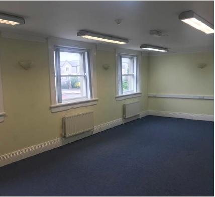 To Let: Office Building with Car Parking Facilities. The property comprises a detached two storey office building set on a self-contained site with adequate car parking, surrounded by mature trees and lawns. The property is configured internally to provide a range of open plan and cellular office accommodation, reception and kitchen over ground and first floors. Certain offices also benefit from raised access flooring, fluorescent strip lighting and sliding sash double glazed windows. ACCOMMODATION Ground Floor - 2,060 sq ft First Floor - 1,654 sq ft