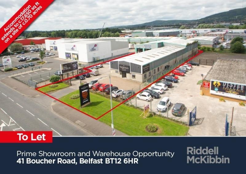 To Let The property comprises Showroom, offices and warehousing accommodation of c 17,650 sq ft on a self contained site extending to c 0.70 acres. The building has been constructed of steel portal frame with insulated double skin metal clad panels and block/brick walls to c 2.25m and a pitched metal clad roof with integrated double skin roof lights. The office accommodation is finished to a good specification to include a combination of tiled/carpeted floors, plastered and painted walls, suspended ceilings and fluorescent lighting. The first floor showroom benefits from tiled flooring, plastered & painted walls, suspended ceilings and air conditioning. The warehouse accommodation is finished with concrete floor and block walls to c 2.25m with lighting provided by Perspex roof lights and sodium units. Access to the warehousing is facilitated by 3 no. electrically operated roller shutter doors giving a 4.4m width and 4.7m height clearance. Eaves height in the unit is 5.5m rising to 7.0m at the centre pitch.