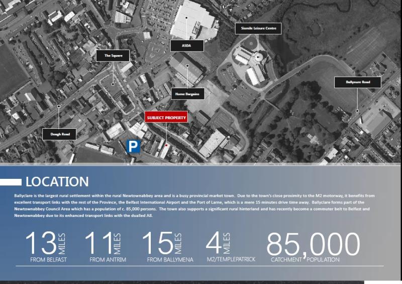 To Let: Town centre offices (available to let in 1 or 3 suites) The subject property is prominently located on Main Street in the heart of Ballyclare’s prime retail area. Formerly anchored by Bank of Ireland, the old banking hall is soon to be the new home of CIP Insurance. Accommodation (Available To Let in 1 or 3 Suites) SUITE 1 (Accessed from front of property) – 1,000 sq ft SUITE 2 (Accessed from front of property) – 880 sq ft SUITE 3 (Assessed from side of property) – 1,125 sq ft RENTAL Office Suite 1 – £7,500 p.a. Office Suite 2 – £6,600 p.a. Office Suite 3 – £8,450 p.a.