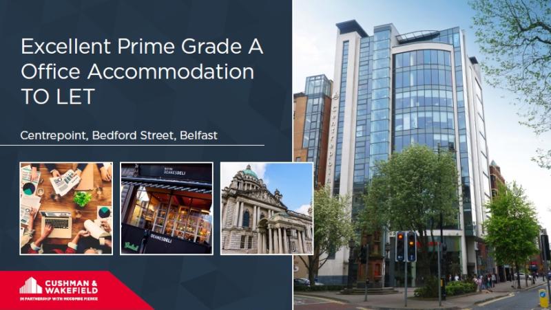 To Let: 1st Floor Grade A Office Accommodation Centrepoint is a 10 storey modern office building completed to the highest of standards approx 10 yrs ago and still offers excellent Grade A office accommodation. The building is accessed off Ormean Avenue by way of an automated entrance door into a double height entrance lobby with a manned feature reception area. Each floor is self-contained and extends to approx 3,450sqft (320sqm). FINISHES INCLUDE: • Plastered and painted walls • Suspended ceilings with integrated lighting • Raised access computer floors with carpet floor covering • Electric power distribution and floor boxes insitu • Finished floor to ceiling height of 2.75m • Individual ventilation, comfort cooling / heating per floor with heat recovery • Intruder alarm interface to each floor • Integrated fire alarm system • Audio/visial access control system • 2 passenger lifts • Male/female toilet facilities • Shower and disabled facilities • Current layout offers 2 private offices, meeting room, comms room and break out area.