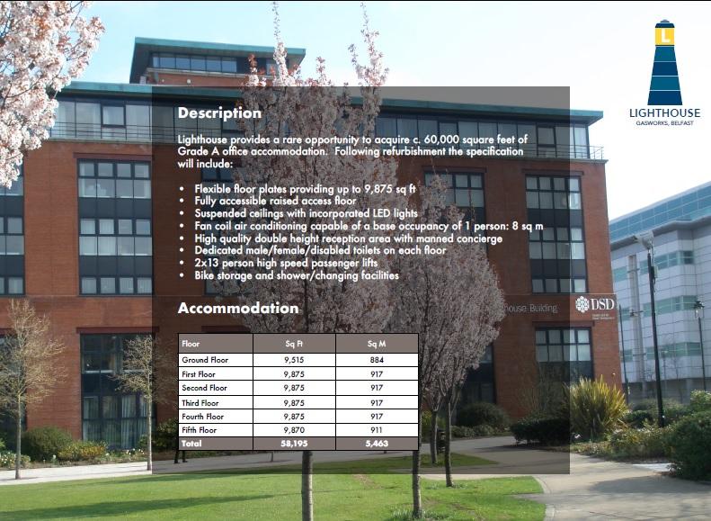 To Let: Grade A Office Space. Lighthouse provides a rare opportunity to acquire c. 60,000 square feet of Grade A office accommodation. Following refurbishment the specification will include: • Flexible floor plates providing up to 9,875 sq ft • Fully accessible raised access floor • Suspended ceilings with incorporated LED lights • Fan coil air conditioning capable of a base occupancy of 1 person: 8 sq m • High quality double height reception area with manned concierge • Dedicated male/female/disabled toilets on each floor • 2x13 person high speed passenger lifts • Bike storage and shower/changing facilities ACCOMMODATION Ground Floor - 9,515 sq ft First Floor - 9,875 sq ft Second Floor - 9,875 sq ft Third Floor - 9,875 sq ft Fourth Floor - 9,875 sq ft Fifth Floor - 9,870 sq ft To view a video of the property follow the below link: https://youtu.be/j_59E6-u9JQ Updated 31/10/19