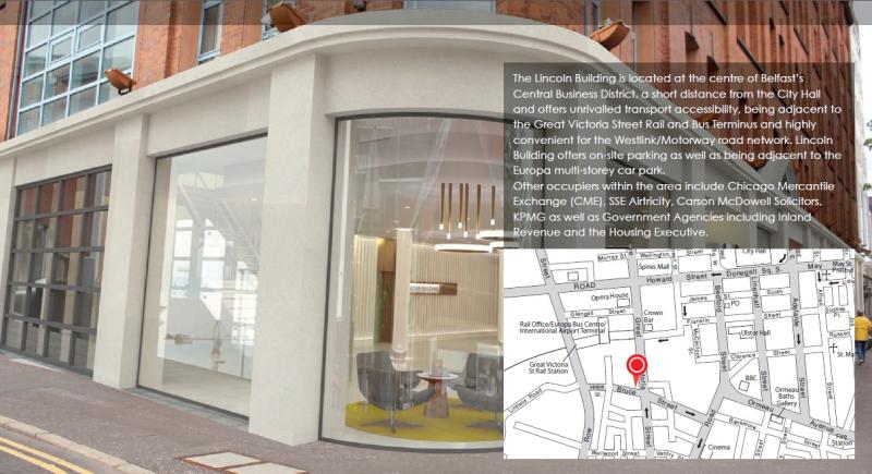 Lincoln Building presents fully refurbished Grade A office accommodation over seven floors with a new entrance and extensive frontage to Great Victoria Street.