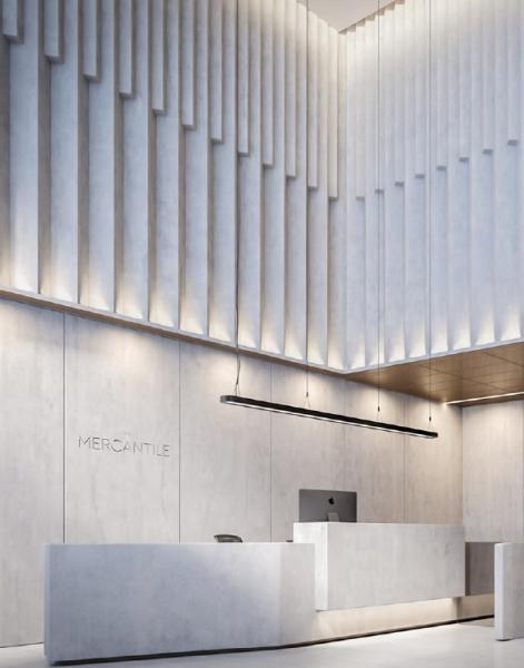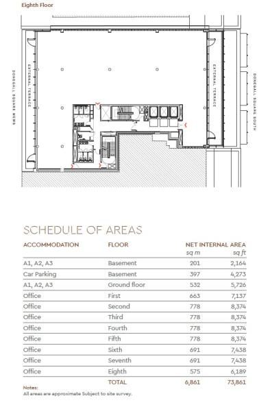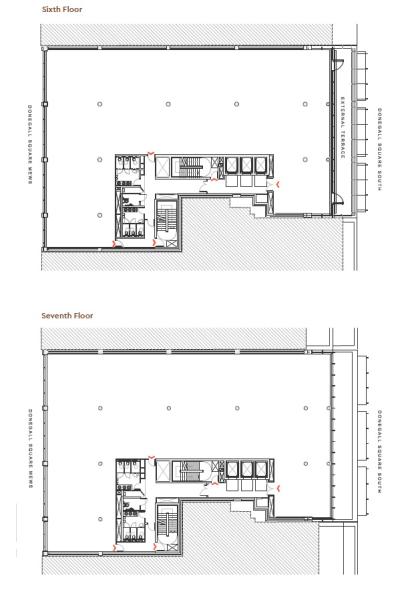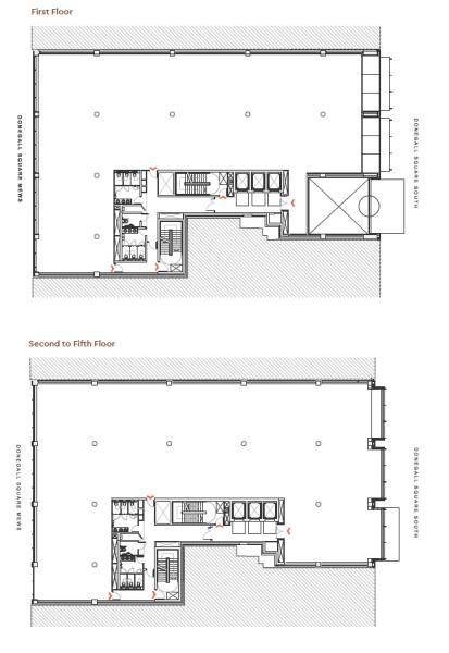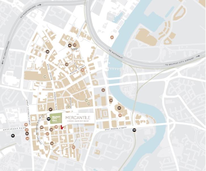 To Let: New City Centre Office Development. The Mercantile is an exemplar of modern grade A office space, occupying Belfast’s premier city-centre location overlooking the City Hall. When completed in Q3 2020, it will offer flexible Grade A office space over 8 upper floors with typical floor plates of c. 8,500 sq ft NIA, premier restaurant/leisure space on the ground and lower ground floors together with car parking. Rigorous attention to sustainable design means that the building will achieve a BREEAM rating of ‘Excellent’. Design : ·· 73,000 sq ft of Grade A office space. ·· Anodised aluminium glazed external façade overlooking Belfast City Hall. ·· Efficient floor grid design 7m x 9m clear span. ·· Slab to slab height 3.7m. ·· External terraces on upper floors overlooking City Hall. ·· Design occupancy based on 1 person per 8 sq m. ·· Centralised core to facilitate a variety of space plan layouts.
